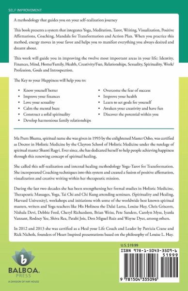 A methodology that guides you on your self-realization journey This book presents a system that integrates Yoga, Meditation, Tarot, Writing, Visualization, Positive Affirmations, Coaching, Mandala for Transformation and Action Plan. When you practice this method, energy moves in your favor and helps you to manifest everything you always desired and dreamt about. This work will guide you in improving the twelve most important areas in your life: Identity, Finances, Mind, Home/Family, Health, Creativity/Fun, Relationships, Sexuality, Spirituality, Work/Profession, Goals and Introspection. The Key to your Happiness will help you to: ¿ Know yourself better ¿ Improve your finances ¿ Love your sexuality ¿ Calm the mental buzz ¿ Construct a solid spirituality ¿ Develop harmonious family relationships ¿ Overcome the fear of success ¿ Improve your health ¿ Learn to set goals for yourself ¿ Awaken your creativity and have fun ¿ Discover the potential within you