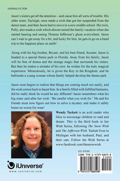 Jason's sisters get all the attention-and cause him all sorts of trouble. His older sister, Tayleigh, once made a wish that got her suspended from the dance team, and then Jason had to move to a new middle school. His twin, Polly, also made a wish which almost ruined the family vacation when she started hearing and seeing Thomas Jefferson's ghost everywhere. Jason can't wait to get away for a bit, and lucky for him, he gets to go on a band trip to the happiest place on earth! Along with his big brother, Bryant, and his best friend, Scooter, Jason is headed to a special theme park in Florida. Away from his family, Jason will be free of drama and the strange magic that surrounds his sisters. But then he makes a mistake of his own: he wishes for the truly magical experience. Miraculously, he is given the Key to the Kingdom, and he befriends a young woman whose family helped develop the theme park. Jason soon begins to realize that things are coming much too easily, and the wish comes back to haunt him. In a family filled with fulfilled fantasies, did he really think he would be any different? Jason remembers what his big sister said after her wish: "Be careful what you wish for." He and his friends must now figure out how to solve a mystery and make it safely home no worse for wear!