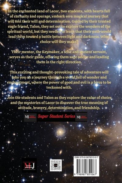 In the enchanted land of Lacor, two students, with hearts full of curiosity and courage, embark on a magical journey that will test their will and determination. Guided by their trusted eagle friend, Talon, they set out to explore the wonders of the spiritual world, but they needed to learn that their path would lead them toward a battle between light and darkness. What choice will they make? Their mentor, the Keymaker, a wise and ancient servant, serves as their guide, offering them sage advice and leading them in the right direction. This exciting and thought-provoking tale of adventure will take you on a journey through a world full of wonder and enchantment, where the power of good and evil is a force to be reckoned with. Join the students and Talon as they explore the value of choice and the mysteries of Lacor to discover the true meaning of attitude, bravery, determination, and friendship.