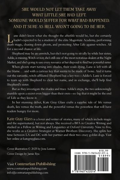 Lane didn't know what she thought the afterlife would be, but she certainly hadn't expected to be a student of the elite Magistrate Academy, performing death magic, chasing down ghosts, and protecting After Life against witches. All for a second chance at life. Shepherd may be an unwitch, but she's not going to sit idly by while her sister, Addie, is missing. Witch or not, she's still one of the most notorious dealers at the Night Market, and she's going to use every resource at her disposal to find her powerful sister. When ghosts start turning into shades, their souls dying, Lane is left with all the blame... and with a curious key that seems to be made of bone. And it turns out the sarcastic, witch-affiliated Shepherd has a key too-Addie's. Lane is forced to team up with Shepherd to clear her name, and in exchange, she'll help find Shepherd's sister. But as they investigate the shades and trace Addie's steps, the two unknowingly stumble upon a secret even bigger than their own-so big that it might be the end of Life as they know it. In her stunning debut, Kate Gray Glass crafts a sapphic tale of life versus death, lies versus the truth, and the powerful versus the powerless that will have readers hungry for more.