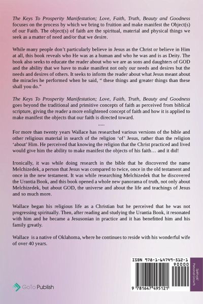 The Keys To Prosperity Manifestation; Love, Faith, Truth, Beauty and Goodness focuses on the process by which we bring to fruition and make manifest the Object(s) of our Faith. The object(s) of faith are the spiritual, material and physical things we seek as a matter of need and/or that we desire. While many people don't particularly believe in Jesus as the Christ or believe in Him at all, this book reveals who He was as a human and who he was and is as Deity. The book also seeks to educate the reader about who we are as sons and daughters of GOD and the ability that we have to make manifest not only our needs and desires but the needs and desires of others. It seeks to inform the reader about what Jesus meant about the miracles he performed when he said, " these things and greater things than these shall you do." The Keys To Prosperity Manifestation; Love, Faith, Truth, Beauty and Goodness goes beyond the traditional and primitive concepts of faith as perceived from biblical scripture, giving the reader a more enlightened concept of faith and how it is applied to make manifest the objects that our faith is directed toward.
