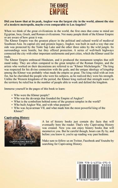 Did you know that at its peak, Angkor was the largest city in the world, almost the size of a modern metropolis, maybe even comparable to Los Angeles? When we think of the great civilizations in the world, the first ones that come to mind are Egyptian, Inca, Greek, and Roman civilizations. Not many people think of the Khmer Empire or are aware of how great it was. The Khmer Empire was the greatest player in the political and cultural world of medieval Southeast Asia. Its capital city and greatest legacy, Angkor, was built in such a way that one side was protected by the Tonle Sap Lake and the other three sides by the wild jungle. Its surroundings were hostile, but they offered protection. A series of well-built highways connected the city with other important settlements and port cities, which the Khmer used for trade. The Khmer Empire embraced Hinduism, and it produced the monument temples that still stand today. They are often compared to the great temples of the Roman Empire, and the artists who worked on their decorations are referred to as "Khmer Michelangelo." The king was respected for his divine connection with the gods, and the unique ideology of kingship among the Khmer was probably what made the empire so great. The king ruled with an iron fist, but he cherished the people who were his subjects, as he realized they were his strength. Unlike the Western kingdoms of the period, the Khmer king realized that strength wasn't in the territory he ruled but in the number of people able to work and defend the kingdom. This captivating guide through the history of the Khmer Empire captures this ideology of Khmer kingship and dissects it so it is understandable to Western readers. But this book also tells the stories of the great kings who ruled the empire, or at least those stories that are known to us from the little sources that were left behind. For no matter how great the Khmer Empire was, there was little left behind. The temple steles are written more as if they are inventory lists than a story of its patrons. Nevertheless, the temples were built with great symbolism in mind. Their size, orientation, construction, and their decorations were all carefully chosen to represent their Hindu or Buddhist belief system. There is a hidden meaning behind every stone laid down, behind every tower constructed and bas-relief engraved. But many of these mysteries are yet to be discovered. Immerse yourself in the pages of this book to learn:Who were the Khmer people? Who was the devaraja that founded the Empire of Angkor? What is the symbolism behind some of the greatest temples in the world? Who built Angkor Wat, and with what purpose? How did a whole nation convert to Buddhism in under one century? Who was Jayavarman VII, and what made him the most powerful king of the Khmer? How did such a great empire fall into oblivion? How was it rediscovered and rebuilt? And much more! Scroll up and click the "add to cart" button to learn more about the history of the Khmer Empire!
