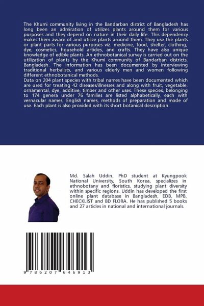 The Khumi community living in the Bandarban district of Bangladesh has long been an admiration of utilizes plants around them for various purposes and they depend on nature in their daily life. This dependency makes them aware of and utilize plants around them. They use the plants or plant parts for various purposes viz. medicine, food, shelter, clothing, dye, cosmetics, household articles, and crafts. They have also unique knowledge of edible plants. An ethnobotanical survey is carried out on the utilization of plants by the Khumi community of Bandarban districts, Bangladesh. The information has been documented by interviewing traditional herbalists, and various elderly men and women following different ethnobotanical methods. Data on 204 plant species with tribal names have been documented which are used for treating 42 diseases/illnesses and along with fruit, vegetable, ornamental, dye, additive, timber and other uses. These species, belonging to 174 genera under 76 families are listed alphabetically, each with vernacular names, English names, methods of preparation and mode of use. Each plant is also provided with its short botanical description.
