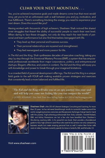 Climb Your Next Mountain . . . Yes, you've achieved impressive goals and made dreams come true that most would envy, yet you've hit an unforeseen wall-a wall between you and joy, motivation, and true fulfillment. There's something blocking the energy you need to experience your next dream. Does this sound like you? Having worked with thousands of high achievers, Shasheen Shah noticed the shared inner struggles that thwart the ability of successful people to reach their next level. When daring to face these struggles, not only do they reach the next levels of personal and team performance but also find themselves reengaged with life. ¿ They level up their personal and business success. ¿ Their personal relationships are repaired and strengthened. ¿ They feel reenergized and more passionate about life. In The Kid and the King, Shah synthesizes decades of executive coaching, taking you step by step through the Emotional Mastery Process (EMP), a system that has empowered professionals worldwide from major corporations, politics, and entrepreneurial startups. Elegant, effective, and potent in content, The Kid and the King will equip you with knowledge and power to break through your imagined limitations. In a crowded field of personal development offerings, The Kid and the King is a unique field guide to the self-YOUR self, making available proven strategies and exercises that consistently lead to a more balanced and fulfilled life.