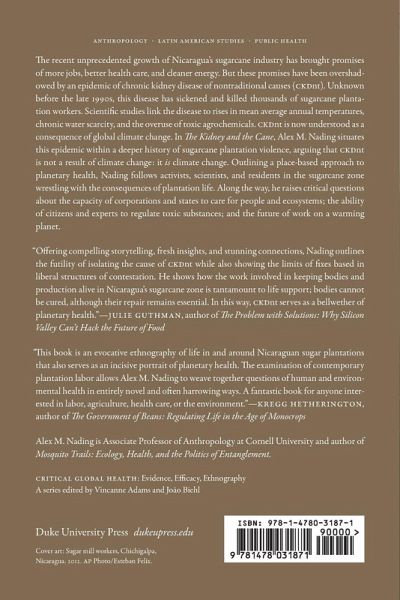 The recent unprecedented growth of Nicaragua's sugarcane industry has brought promises of more jobs, better health care, and cleaner energy. But these promises have been overshadowed by an epidemic of chronic kidney disease of nontraditional causes (CKDnt). Unknown before the late 1990s, this disease has sickened and killed thousands of sugarcane plantation workers. Scientific studies link the disease to rises in mean average annual temperatures, chronic water scarcity, and the overuse of toxic agrochemicals. CKDnt is now understood as a consequence of global climate change. In The Kidney and the Cane, Alex M. Nading situates this epidemic within a deeper history of sugarcane plantation violence, arguing that CKDnt is not a result of climate change: it is climate change. Outlining a place-based approach to planetary health, Nading follows activists, scientists, and residents in the sugarcane zone wrestling with the consequences of plantation life. Along the way, he raises critical questions about the capacity of corporations and states to care for people and ecosystems; the ability of citizens and experts to regulate toxic substances; and the future of work on a warming planet.