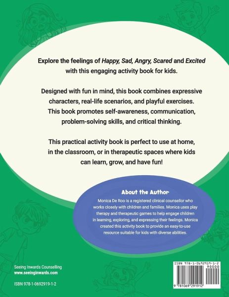 Explore the feelings of Happy, Sad, Angry, Scared and Excited with this engaging activity book for children.Designed with fun in mind, this book combines expressive characters, real-life scenarios, and playful exercises.This book promotes self-awareness, communication, problem-solving skills, and critical thinking.This practical activity book is perfect to use at home, in the classroom, or in therapeutic spaces where kids can learn, grow, and have fun!