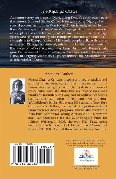 Someone is stealing Vigango from Kenya's south coast beach towns and villages around Shimoni, Diani, and Tiwi, near the historic Shimoni Slaves Caves. Who can it be? Kigango (Singular) / Vigango (Plural) - Mijikenda cultural and memorial totem effigies placed on tombstones of departed, respected, and revered, spiritual elders. The Kigango Oracle is an adventure story set at sea along Kenya's southern coast. It recounts the tale of Kanze, a young Digo girl with special powers. Kanze and her younger brother, Kombo, wake up one morning to find the Mijikenda cultural totem removed from their Grandfather Menza's grave in the family cemetery! The Mijikenda believe that once an erected Kigango is removed, misfortune and curses befall the descendants of the ancestor whose Kigango has been disturbed. Kanze, her brother, Kombo, and their friends Kibibi and Katana, set out to find Kanze and Kombo's late Grandfather Menza's Kigango, which has been stolen by village youths and sold to Clark, a European collector, who intends to smuggle it to Europe. The spirit of Kanze's grandfather, Menza, through a magical Kigango pendant he gives to Kanze in a nightly visitation, helps her to retrieve the Kigango as well as other Vigango in the village. Grandfather Menza was a revered seer and Gohu, a spiritual leader in the Mijikenda community, and belonged to the secret Gohu society, a secret Society of the Blessed. The Menza family Vigango, are revered by the townsfolk and villagers, because they don't rot and are thought to be extraordinarily blessed and magical! In Kenya's coastal region, however, there has been an upsurge in thefts of authentic Vigango, which are coveted by European and American museums, and collectors commission people to steal the artifacts and smuggle them overseas. Grandfather Menza, in a visitation to Kanze the same night his Kigango is stolen, puts a magical turquoise and jade Kigango, on Kanze's neck. Then Kanze and Kombo's parents tell the two children the circumstances surrounding Kanze's birth and the death of her twin sister, Kache. Soon thereafter, an intriguing oracle prophesied by Grandfather Menza on his deathbed says that Kanze is a gifted spirit-child-The Chosen One, as most townsfolk and villagers call her. Kanze has always felt different from her brother, friends, other children, and students, and it's only upon learning about the oracle that she finally understands her strangeness and uncanny ability of foretelling future events like accidents and averting them, and knowing questions on exam papers at school before the exam day!