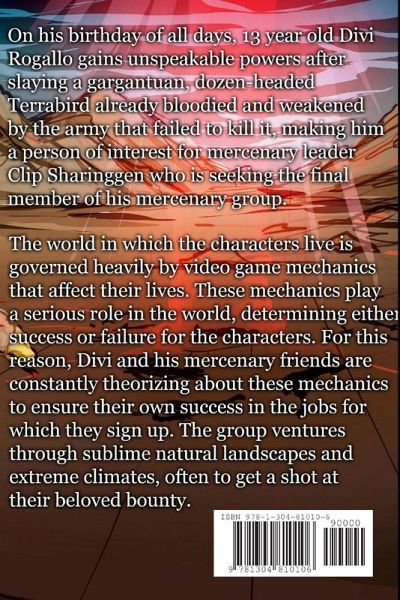 On his birthday of all days, 13 year old Divi Rogallo gains unspeakable powers after slaying a gargantuan, dozen-headed Terrabird already bloodied and weakened by the army that failed to kill it, making him a person of interest for Clip Sharinggen who is seeking the final member of his mercenary group. The world in which they live is governed by video game mechanics that affect their lives. These mechanics are quantified attributes of a person or nonhuman animal such as life (HP), strength, defense, and speed. These mechanics play a serious role in the world, determining either success or failure for the characters. For this reason, Divi and his mercenary friends are constantly theorizing about these mechanics to ensure their own success. The group ventures through sublime natural landscapes and extreme climates, often to get a shot at their beloved bounty. The mechanics of this story are loosely based on RPG systems in video games and most recently: The Quantified Self Movement.