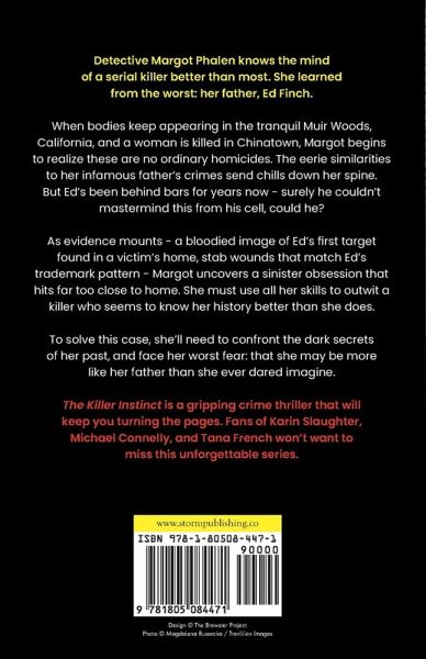 Detective Margot Phalen knows the mind of a serial killer better than most. She learned from the worst: her father, Ed Finch. When bodies keep appearing in the tranquil Muir Woods, California, and a woman is killed in Chinatown, Margot begins to realize these are no ordinary homicides. The eerie similarities to her infamous father's crimes send chills down her spine. But Ed's been behind bars for years now - surely he couldn't mastermind this from his cell, could he? As evidence mounts - a bloodied image of Ed's first target found in a victim's home, stab wounds that match Ed's trademark pattern - Margot uncovers a sinister obsession that hits far too close to home. She must use all her skills to outwit a killer who seems to know her history better than she does. To solve this case, she'll need to confront the dark secrets of her past, and face her worst fear: that she may be more like her father than she ever dared imagine. The Killer Instinct is a gripping crime thriller that will keep you turning the pages. Fans of Karin Slaughter, Michael Connelly and Tana French won't want to miss this unforgettable series.
