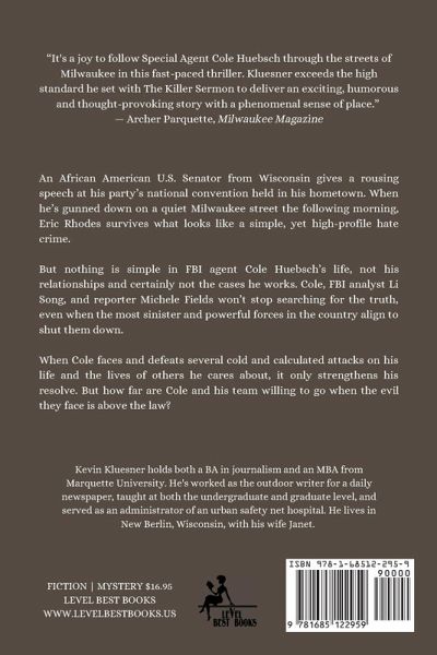 An African American U.S. Senator from Wisconsin gives a rousing speech at his party's national convention held in his hometown. When he's gunned down on a quiet Milwaukee street the following morning, Eric Rhodes survives what looks like a simple, yet high-profile hate crime. But nothing is simple in FBI agent Cole Huebsch's life, not his relationships and certainly not the cases he works. Cole, FBI analyst Li Song, and reporter Michele Fields won't stop searching for the truth, even when the most sinister and powerful forces in the country align to shut them down. When Cole faces and defeats several cold and calculated attacks on his life and the lives of others he cares about, it only strengthens his resolve. But how far are Cole and his team willing to go when the evil they face is above the law?