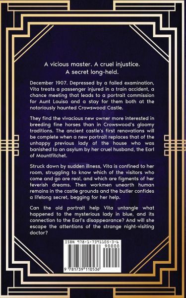 A vicious master. A cruel injustice. A secret long-held. December 1907. Depressed by a failed examination, Vita treats a passenger injured in a train accident, a chance meeting that leads to a portrait commission for Aunt Louisa and a stay for them both at the notoriously haunted Crowswood Castle. They find the vivacious new owner more interested in breeding fine horses than in Crowswood's gloomy traditions. The ancient castle's first renovations will be complete when a new portrait replaces that of the unhappy previous lady of the house who was banished to an asylum by her cruel husband, the Earl of Mountfitchet. Struck down by sudden illness, Vita is confined to her room, struggling to know which of the visitors who come and go are real, and which are figments of her feverish dreams. Then workmen unearth human remains in the castle grounds and the butler confides a lifelong secret, begging for her help. Can the old portrait help Vita untangle what happened to the mysterious lady in blue, and its connection to the Earl's disappearance? And will she escape the attentions of the strange night-visiting doctor?