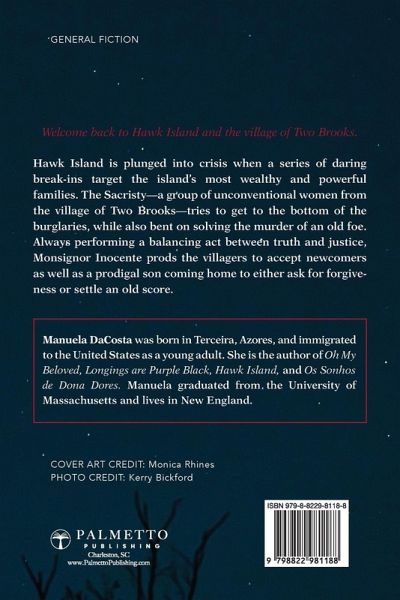 Hawk Island is plunged into crisis when a series of daring break-ins target the island's most wealthy and powerful families. The Sacristy-a group of unconventional women from the village of Two Brooks-tries to get to the bottom of the burglaries, while also bent on solving the murder of an old foe. Always performing a balancing act between truth and justice, Monsignor Inocente prods the villagers to accept newcomers as well as a prodigal son coming home to either ask for forgiveness or settle an old score.