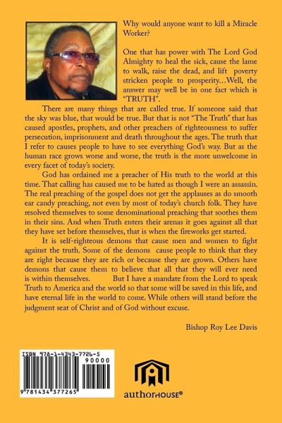 Why would anyone want to kill a Miracle Worker? One that has power with The Lord God Almighty to heal the sick, cause the lame to walk, raise the dead, and lift poverty stricken people to prosperity.Well, the answer may well be in one fact which is "TRUTH". There are many things that are called true. If someone said that the sky was blue, that would be true. But that is not "The Truth" that has caused apostles, prophets, and other preachers of righteousness to suffer persecution, imprisonment and death throughout the ages. The truth that I refer to causes people to have to see everything God's way. But as the human race grows worse and worse, the truth is the more unwelcome in every facet of today's society. God has ordained me a preacher of His truth to the world at this time. That calling has caused me to be hated as though I were an assassin. The real preaching of the gospel does not get the applauses as do smooth ear candy preaching, not even by most of today's church folk. They have resolved themselves to some denominational preaching that soothes them in their sins. And when Truth enters their arenas it goes against all that they have set before themselves, that is when the fireworks get started. It is self-righteous demons that cause men and women to fight against the truth. Some of the demons cause people to think that they are right because they are rich or because they are grown. Others have demons that cause them to believe that all that they will ever need is within themselves. But I have a mandate from the Lord to speak Truth to America and the world so that some will be saved in this life, and have eternal life in the world to come. While others will stand before the judgment seat of Christ and of God without excuse. Bishop Roy Lee Davis