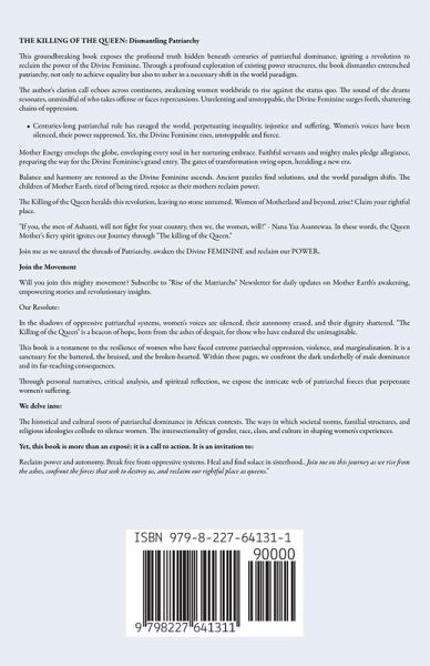 THE KILLING OF THE QUEEN: Dismantling Patriarchy This groundbreaking book exposes the profound truth hidden beneath centuries of patriarchal dominance, igniting a revolution to reclaim the power of the Divine Feminine. Through a profound exploration of existing power structures, the book dismantles entrenched patriarchy, not only to achieve equality but also to usher in a necessary shift in the world paradigm. The author's clarion call echoes across continents, awakening women worldwide to rise against the status quo. The sound of the drums resonates, unmindful of who takes offense or faces repercussions. Unrelenting and unstoppable, the Divine Feminine surges forth, shattering chains of oppression. * Centuries-long patriarchal rule has ravaged the world, perpetuating inequality, injustice and suffering. Women's voices have been silenced, their power suppressed. Yet, the Divine Feminine rises, unstoppable and fierce. Mother Energy envelops the globe, enveloping every soul in her nurturing embrace. Faithful servants and mighty males pledge allegiance, preparing the way for the Divine Feminine's grand entry. The gates of transformation swing open, heralding a new era. Balance and harmony are restored as the Divine Feminine ascends. Ancient puzzles find solutions, and the world paradigm shifts. The children of Mother Earth, tired of being tired, rejoice as their mothers reclaim power. The Killing of the Queen heralds this revolution, leaving no stone unturned. Women of Motherland and beyond, arise! Claim your rightful place. "If you, the men of Ashanti, will not fight for your country, then we, the women, will!" - Nana Yaa Asantewaa. In these words, the Queen Mother's fiery spirit ignites our Journey through "The killing of the Queen." Join me as we unravel the threads of Patriarchy, awaken the Divine FEMININE and reclaim our POWER. Join the Movement Will you join this mighty movement? Subscribe to "Rise of the Matriarchs" Newsletter for daily updates on Mother Earth's awakening, empowering stories and revolutionary insights. Our Resolute: In the shadows of oppressive patriarchal systems, women's voices are silenced, their autonomy erased, and their dignity shattered. "The Killing of the Queen" is a beacon of hope, born from the ashes of despair, for those who have endured the unimaginable. This book is a testament to the resilience of women who have faced extreme patriarchal oppression, violence, and marginalization. It is a sanctuary for the battered, the bruised, and the broken-hearted. Within these pages, we confront the dark underbelly of male dominance and its far-reaching consequences. Through personal narratives, critical analysis, and spiritual reflection, we expose the intricate web of patriarchal forces that perpetuate women's suffering. We delve into: The historical and cultural roots of patriarchal dominance in African contexts. The ways in which societal norms, familial structures, and religious ideologies collude to silence women. The intersectionality of gender, race, class, and culture in shaping women's experiences. Yet, this book is more than an exposé; it is a call to action. It is an invitation to: Reclaim power and autonomy. Break free from oppressive systems. Heal and find solace in sisterhood. "The Killing of the Queen" is a haven for: - Survivors of domestic violence and abuse. - Women marginalized by societal expectations. - Those seeking spiritual awakening and empowerment. Join me on this journey as we rise from the ashes, confront the forces that seek to destroy us, and reclaim our rightful place as queens."