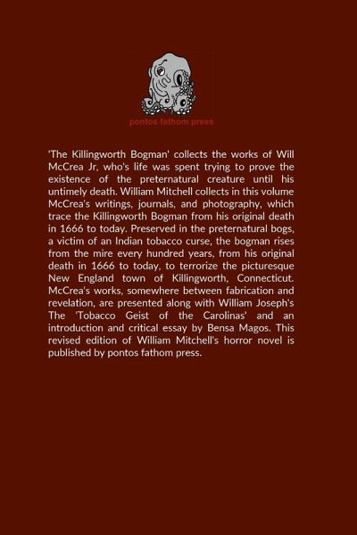 'The Killingworth Bogman' collects the works of Will McCrea Jr, who's life was spent trying to prove the existence of the preternatural creature until his untimely death. William Mitchell collects in this volume McCrea's writings, journals, and photography, which trace the Killingworth Bogman from his original death in 1666 to today. Preserved in the preternatural bogs, a victim of an Indian tobacco curse, the bogman rises from the mire every hundred years, from his original death in 1666 to today, to terrorize the picturesque New England town of Killingworth, Connecticut. McCrea's works, somewhere between fabrication and revelation, are presented along with William Joseph's The 'Tobacco Geist of the Carolinas' and an introduction and critical essay by Bensa Magos. This revised edition of William Mitchell's horror novel is published by pontos fathom press.