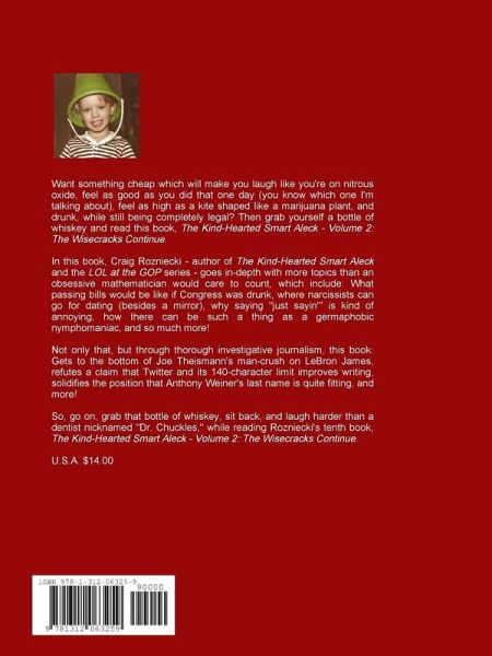 Want something cheap which will make you laugh like you're on nitrous oxide, feel as high as a kite shaped like a marijuana plant, and drunk, while still being completely legal? Then grab yourself a bottle of whiskey and read this book, The Kind-Hearted Smart Aleck - Volume 2: The Wisecracks Continue. In this book, Craig Rozniecki - author of The Kind-Hearted Smart Aleck and the LOL at the GOP series - goes in-depth with more topics than an obsessive mathematician would care to count, which include: What passing bills would be like if Congress was drunk, where narcissists can go for dating (besides a mirror), why saying "just sayin'" is kind of annoying, how there can be such a thing as a germaphobic nymphomaniac, and more! So, go on, grab that bottle of whiskey, sit back, and laugh harder than a dentist nicknamed "Dr. Chuckles," while reading Rozniecki's tenth book, The Kind-Hearted Smart Aleck - Volume 2: The Wisecracks Continue.