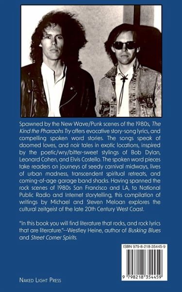 Spawned by the New Wave/Punk scenes of the 1980s, The Kind the Pharaohs Try offers evocative story-song lyrics, and compelling spoken word stories. The songs speak of doomed loves, and noir tales in exotic locations, inspired by the poetic/wry/bitter-sweet stylings of Bob Dylan, Leonard Cohen, and Elvis Costello. The spoken word pieces take readers on journeys of seedy carnival midways, lives of urban madness, transcendent spiritual retreats, and coming-of-age garage band shacks. Having spanned the rock scenes of 1980s San Francisco and LA, to National Public Radio and Internet storytelling, this compilation of writings by Michael and Steven Meloan explores the cultural zeitgeist of the late 20th Century West Coast. "In this book you will find literature that rocks, and rock lyrics that are literature."--Westley Heine, author of Busking Blues and Street Corner Spirits.