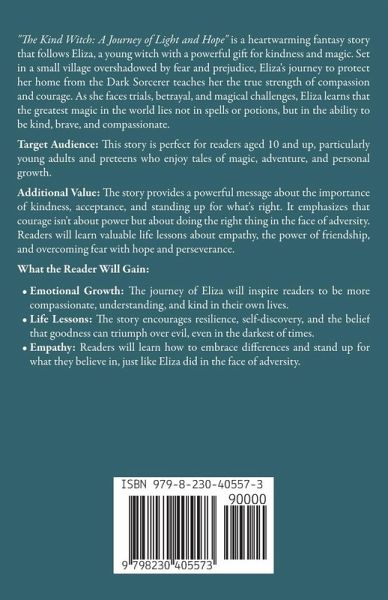 "The Kind Witch: A Journey of Light and Hope" is a heartwarming fantasy story that follows Eliza, a young witch with a powerful gift for kindness and magic. Set in a small village overshadowed by fear and prejudice, Eliza's journey to protect her home from the Dark Sorcerer teaches her the true strength of compassion and courage. As she faces trials, betrayal, and magical challenges, Eliza learns that the greatest magic in the world lies not in spells or potions, but in the ability to be kind, brave, and compassionate. Target Audience: This story is perfect for readers aged 10 and up, particularly young adults and preteens who enjoy tales of magic, adventure, and personal growth. Additional Value: The story provides a powerful message about the importance of kindness, acceptance, and standing up for what's right. It emphasizes that courage isn't about power but about doing the right thing in the face of adversity. Readers will learn valuable life lessons about empathy, the power of friendship, and overcoming fear with hope and perseverance. What the Reader Will Gain:Emotional Growth: The journey of Eliza will inspire readers to be more compassionate, understanding, and kind in their own lives. Life Lessons: The story encourages resilience, self-discovery, and the belief that goodness can triumph over evil, even in the darkest of times. Empathy: Readers will learn how to embrace differences and stand up for what they believe in, just like Eliza did in the face of adversity. Let this magical journey warm your heart-if Eliza's courage and kindness touched you, share your thoughts and help others discover the light within The Kind Witch.