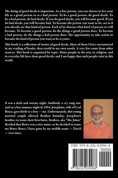 The doing of good deeds is important. As a free person, you can choose to live your life as a good person or as a bad person. To be a good person, do good deeds. To be a bad person, do bad deeds. If you do good deeds, you will become good. If you do bad deeds, you will become bad. To become the person you want to be, act as if you already are that kind of person. Each of us chooses what kind of person we will become. To become a good person, do the things a good person does. To become a bad person, do the things a bad person does. The opportunity to take action to become the kind of person you want to be is yours. This book is a collection of stories of good deeds. Most of them I have encountered in my reading of books, then retold in my own words. A very few come from other sources. This book is organized by topic. Many people in the arts, in religion, and in everyday life have done good deeds, and I am happy that such people exist in this world.