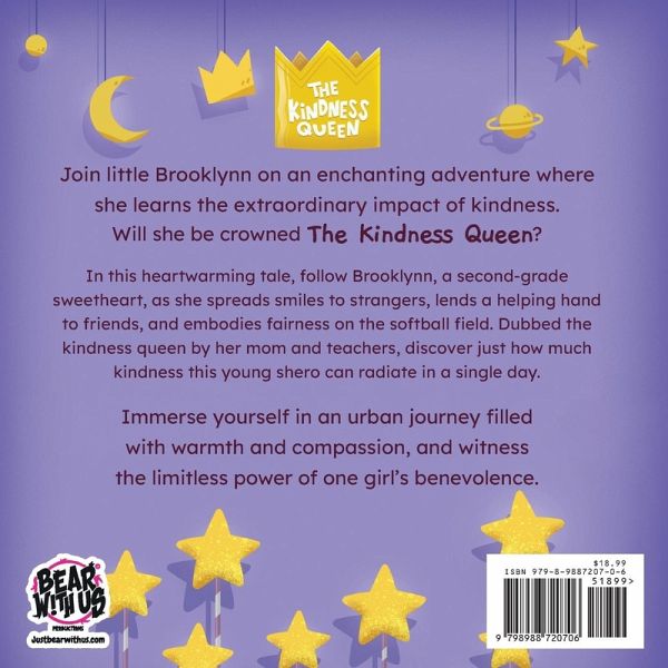 In "The Kindness Queen," we meet Brooklynn, a bright second-grader with an extraordinary gift - the gift of kindness. This enchanting story follows Brooklynn as she embarks on a day filled with delightful adventures in her mission to spread kindness far and wide. Brooklynn's world is a magical place where the simplest acts of kindness create ripples of joy. She's the girl who smiles at strangers on the street, lends a helping hand to her friends in need, and always plays fair at softball games. Everyone around her, from her mom to her teachers, affectionately calls her "The Kindness Queen." ¿¿But the real question is: How much kindness can this queen fit into one day? Discover the answers to this heartwarming question as you follow Brooklynn's adventures in "The Kindness Queen." This delightful story not only captivates young readers but also imparts essential life lessons about empathy, compassion, and the power of simple acts of kindness.