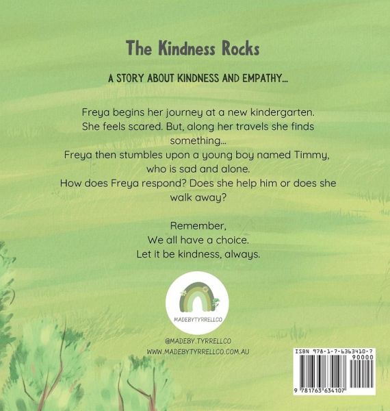 This story is about young Freya who feels a range of emotions when attending a new kindergarten - in a brand new place. It wasn't easy for Freya, she was nervous. During her travels, slowly finding her way around the new playground, Freya is stopped in her tracks by a shiny object amongst the bushes. She finds a rock... a special rock. This special rock makes her feel better and keeps her going. Along the way, Freya stumbles upon a young boy named Timmy who is upset. She responds with acts of kindness and true empathy. Soon after...they became friends. Excellent friends who begin a new, exciting and creative project together. They called it "The Kindness Rocks". These two young humans are changing the world one rock at a time! Kindness costs nothing, so if you can be anything in this world, just be a kid with kindness! P.S. Kindness does rock!!
