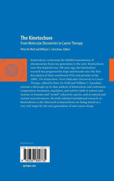 Kinetochores orchestrate the faithful transmission of chromosomes from one generation to the next. Kinetochores were first depicted over 100 years ago, but kinetochore research has progressed by leaps and bounds since the first description of their constituent DNA and proteins in the 1980s. "The Kinetochore: from Molecular Discoveries to Cancer Therapy" presents a thorough up-to-date analysis of kinetochore and centromere composition, formation, regulation, and activity, both in mitosis and meiosis, in humans and "model" eukaryotic species, and at natural and mutant neocentromeres. Recently initiated translational research on kinetochores is also discussed as kinetochores are being mined as a very rich target for the next generations of anti-cancer drugs.