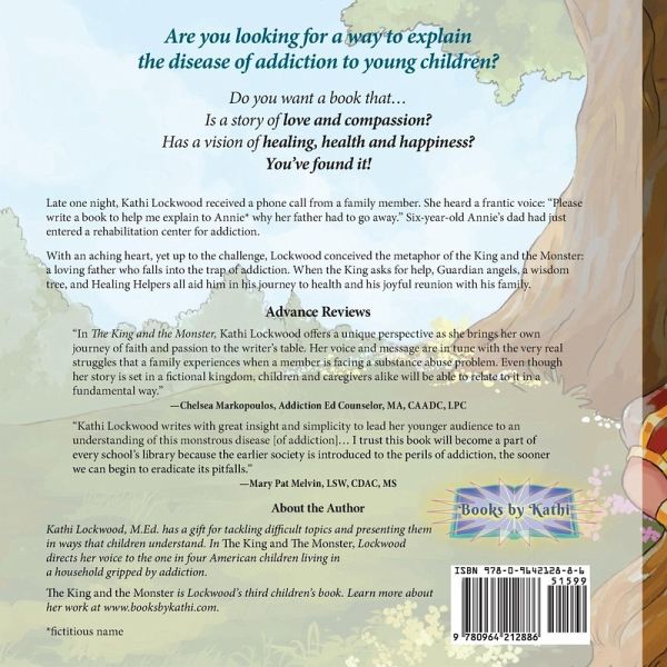 Are you looking for a way to explain the disease of addiction to young children? Do you want a book that... Is a story of love and compassion? Has a vision of healing, health and happiness? You've found it! Late one night, Kathi Lockwood received a phone call from a family member. She heard a frantic voice: "Please write a book to help me explain to Annie* why her father had to go away." Six-year-old Annie's dad had just entered a rehabilitation center for addiction. With an aching heart, yet up to the challenge, Lockwood conceived the metaphor of the King and the Monster: a loving father who falls into the trap of addiction. When the King asks for help, Guardian angels, a wisdom tree, and Healing Helpers all aid him in his journey to health and his joyful reunion with his family. *fictitious name