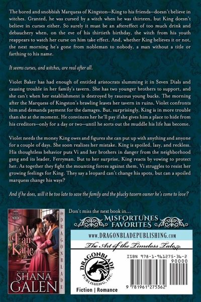 The bored and snobbish Marquess of Kingston-King to his friends-doesn't believe in witches. Granted, he was cursed by a witch when he was thirteen, but King doesn't believe in curses either. So surely it must be an aftereffect of too much drink and debauchery when, on the eve of his thirtieth birthday, the witch from his youth reappears to watch her curse on him take effect. And, whether King believes it or not, the next morning he's gone from nobleman to nobody, a man without a title or farthing to his name. It seems curses, and witches, are real after all. Violet Baker has had enough of entitled aristocrats slumming it in Seven Dials and causing trouble in her family's tavern. She has two younger brothers to support, and she can't when her establishment is destroyed by raucous young bucks. The morning after the Marquess of Kingston's brawling leaves her tavern in ruins, Violet confronts him and demands payment for the damages. But, surprisingly, King is in more trouble than she at the moment. He convinces her he'll pay if she gives him a place to hide from his creditors-only for a day or two-until he sorts out the muddle his life has become. Violet needs the money King owes and figures she can put up with anything and anyone for a couple of days. She soon realizes her mistake. King is spoiled, lazy, and reckless. His thoughtless behavior puts Vi and her brothers in danger from the neighborhood gang and its leader, Ferryman. But to her surprise, King reacts by vowing to protect her. As together they fight the mounting forces against them, Vi struggles to resist her growing feelings for King. They say a leopard can't change his spots, but can a spoiled marquess change his ways? And if he does, will it be too late to save the family and the plucky tavern owner he's come to love? Misfortunes Favorites The King and Vi My Fair Katie All About Genevieve