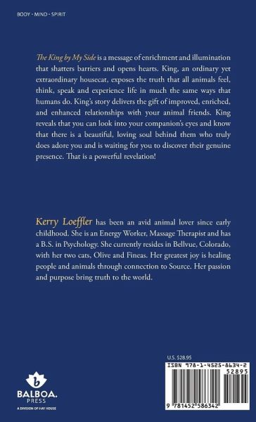 The King by My Side is a message of enrichment and illumination that shatters barriers and opens hearts. King, an ordinary yet extraordinary housecat, exposes the truth that all animals feel, think, speak and experience life in much the same ways that humans do. King's story delivers the gift of improved, enriched, and enhanced relationships with your animal friends. King reveals that you can look into your companion's eyes and know that there is a beautiful, loving soul behind them who truly does adore you and is waiting for you to discover their genuine presence. That is a powerful revelation!