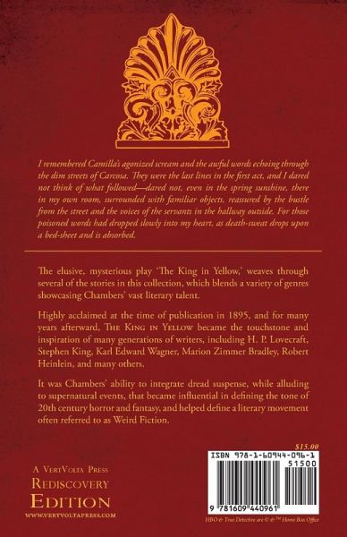 I remembered Camilla’s agonized scream and the awful words echoing through the dim streets of Carcosa. They were the last lines in the first act, and I dared not think of what followed—dared not, even in the spring sunshine, there in my own room, surrounded with familiar objects, reassured by the bustle from the street and the voices of the servants in the hallway outside. For those poisoned words had dropped slowly into my heart, as death-sweat drops upon a bed-sheet and is absorbed. The elusive, mysterious play ‘The King in Yellow,’ weaves through several of the stories in this collection, which blends a variety of genres showcasing Chambers’ vast literary talent. Highly acclaimed at the time of publication in 1895, and for many years afterward, The King in Yellow became the touchstone and inspiration of many generations of writers, including H. P. Lovecraft, Stephen King, Karl Edward Wagner, Marion Zimmer Bradley, Robert Heinlein, and many others. It was Chambers’ ability to integrate dread suspense, while alluding to supernatural events, that became influential in defining the tone of 20th century horror and fantasy, and helped define a literary movement often referred to as Weird Fiction.
