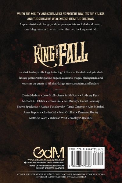 When the mighty and cruel must be brought low, it's the killers and the schemers who emerge from the shadows. As plans twist and change, and our protagonists are foiled and beaten, one thing remains true: no matter the cost, the king must fall. The King Must Fall is a dark fantasy anthology featuring 19 titans of the dark and grimdark fantasy genres writing about rogues, assassins, mages, blackguards, and warriors on quests to kill their kings, rulers, captains, and leaders. Devin Madson Luke Scull Anna Smith Spark Anthony Ryan Michael R. Fletcher Jeremy Szal Lee Murray Daniel Polansky Shawn Speakman Adrian Tchaikovsky Trudi Canavan Alex Marshall Anna Stephens Justin Call Deborah A. Wolf Peter Orullian Kameron Hurley Matthew Ward Bradley P. Beaulieu