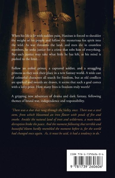 A gripping new adventure of drama and dark fantasy, set in an all new world of spirits and war. As prince of a powerful forest kingdom, Hanitan has faced pressure before. But when his life is turned upside down, he has to set off into the world in a quest for revenge and freedom, before his emotions overcome him. And with the powerful feathered warriors of the north closing in, he must decide if his enemies are really who he suspects... Alongside him are told the stories of many colourful characters who inhabit the world and are each desperate for control and liberty in their own lives, which intertwine and tell a complex story of war, loss, power and independence. As battles rage on and the forest itself is threatened, can the men and women under its canopy ever find the peace they seek? In an epic tale of succession and lineage, follow well-rounded characters as they each attempt to make the most of the cards they have been dealt in a world that runs on blood and spears, where lives are the cost of freedom and rebellion carries the heaviest of tolls.