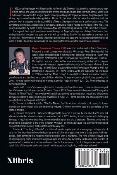 In 1963, Angelina Harper was fifteen and a half years old. She was just entering her sophomore year of high school and was looking forward to driving and beginning to date. Her high school years take a dramatic turn when the king of hearts playing card begin to appear wherever Angelina goes. She slowly begins to realize she is being stalked. Horror fills her life as she discovers that each boy that she goes out with is savagely murdered, and king of hearts playing cards are left at each murder scene. The day after each murder, she receives a sympathy card with a king of hearts playing card in the mail. The police are baffled by these crimes. Clues are few and nonyielding as police try to catch this criminal. The saga of the king of hearts continues throughout Angelina's high school days. She lives in fear and realizes that whoever she goes out with will be murdered. Finally, this saga takes a dramatic turn as the killer finally makes a mistake that helps police solve the case and frees Angelina from this serial killer in 1966. I hope that each reader of this exciting thriller enjoys the mystery as it unfolds.
