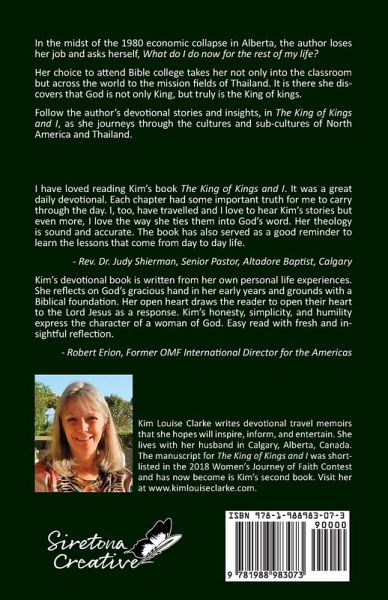 In the midst of the 1980 economic collapse in Alberta, the author loses her job and asks herself, What do I do now for the rest of my life? Her choice to attend Bible college takes her not only into the classroom but across the world to the mission fields of Thailand. It is there she discovers that God is not only King, but truly is the King of kings. Follow the author's devotional stories and insights, in The King of Kings and I, as she journeys through the cultures and sub-cultures of North America and Thailand.