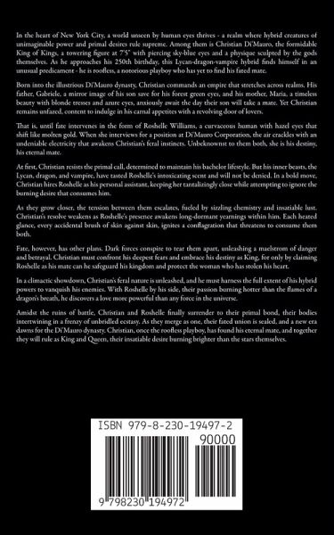 In the heart of New York City, a world unseen by human eyes thrives - a realm where hybrid creatures of unimaginable power and primal desires rule supreme. Among them is Christian Di'Mauro, the formidable King of Kings, a towering figure at 7'5" with piercing sky-blue eyes and a physique sculpted by the gods themselves. As he approaches his 250th birthday, this Lycan-dragon-vampire hybrid finds himself in an unusual predicament - he is roofless, a notorious playboy who has yet to find his fated mate. Born into the illustrious Di'Mauro dynasty, Christian commands an empire that stretches across realms. His father, Gabriele, a mirror image of his son save for his forest green eyes, and his mother, Maria, a timeless beauty with blonde tresses and azure eyes, anxiously await the day their son will take a mate. Yet Christian remains unfazed, content to indulge in his carnal appetites with a revolving door of lovers. That is, until fate intervenes in the form of Roshelle Williams, a curvaceous human with hazel eyes that shift like molten gold. When she interviews for a position at Di'Mauro Corporation, the air crackles with an undeniable electricity that awakens Christian's feral instincts. Unbeknownst to them both, she is his destiny, his eternal mate. At first, Christian resists the primal call, determined to maintain his bachelor lifestyle. But his inner beasts, the Lycan, dragon, and vampire, have tasted Roshelle's intoxicating scent and will not be denied. In a bold move, Christian hires Roshelle as his personal assistant, keeping her tantalizingly close while attempting to ignore the burning desire that consumes him. As they grow closer, the tension between them escalates, fueled by sizzling chemistry and insatiable lust. Christian's resolve weakens as Roshelle's presence awakens long-dormant yearnings within him. Each heated glance, every accidental brush of skin against skin, ignites a conflagration that threatens to consume them both. Fate, however, has other plans. Dark forces conspire to tear them apart, unleashing a maelstrom of danger and betrayal. Christian must confront his deepest fears and embrace his destiny as King, for only by claiming Roshelle as his mate can he safeguard his kingdom and protect the woman who has stolen his heart. In a climactic showdown, Christian's feral nature is unleashed, and he must harness the full extent of his hybrid powers to vanquish his enemies. With Roshelle by his side, their passion burning hotter than the flames of a dragon's breath, he discovers a love more powerful than any force in the universe. Amidst the ruins of battle, Christian and Roshelle finally surrender to their primal bond, their bodies intertwining in a frenzy of unbridled ecstasy. As they merge as one, their fated union is sealed, and a new era dawns for the Di'Mauro dynasty. Christian, once the roofless playboy, has found his eternal mate, and together they will rule as King and Queen, their insatiable desire burning brighter than the stars themselves.