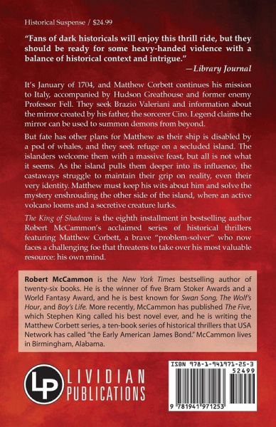 It's January of 1704, and Matthew Corbett continues his mission to Italy, accompanied by Hudson Greathouse and former enemy Professor Fell. They seek Brazio Valeriani and information about the mirror created by his father, the sorcerer Ciro. Legend claims the mirror can be used to summon demons from beyond. But fate has other plans for Matthew as their ship is disabled by a pod of whales, and they seek refuge on a secluded island. The islanders welcome them with a massive feast, but all is not what it seems. As the island pulls them deeper into its influence, the castaways struggle to maintain their grip on reality, even their very identity. Matthew must keep his wits about him and solve the mystery enshrouding the other side of the island, where an active volcano looms and a secretive creature lurks. The King of Shadows is the eighth installment in bestselling author Robert McCammon's acclaimed series of historical thrillers featuring Matthew Corbett, a brave "problem-solver" who now faces a challenging foe that threatens to take over his most valuable resource: his own mind.