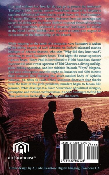 In a land without law, how far do you go to protect the innocent? The year is 1995. On the remote Caribbean island of St. Stephie a seaplane delivers a tall man clad in a pale linen suit. Paul Summers is fleeing a lifetime of lost battles. Released from his marriage and career he's living out his Jimmy Buffett-inspired dream of escaping to "saint somewhere, southeast of disorder" and hence his arrival at the Hotel Caribe Billfish Club, a resort as exotic and elegant as it's location on the distant edge of the islands. While napping on the sands of a turquoise cove Summers is woken by the lilting English of Lark Johnson, an Oxford-educated marine biologist of African descent, who asks "Why did they hurt you?", referring to scars Summers bears. That night the resort sponsors a grand fiesta. There Paul is introduced to Nikki Saunders, former supermodel, now owner-operator of Tiki Charters, a diving and big-game fishing operation, and her sidekick Yolanda "Yoyo" Magana. And on a subsequent moonlit night as Summers and Niki initiate their romance they discover the shark-mauled body of Ophelia Johnson, 14, sister to Lark. When Summers discovers that sharks were the least of the girl's problems, murders begin to bloom like jasmine. What develops is a Force 5 hurricane of political intrigue, corruption and violent confrontation. And for Summers to find his "one particular harbor", he must survive the storm.