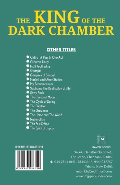 A wonderful allegorical play, "The King of the Dark Chamber," echoes the very rhythm of unearthly and personal rousing of an individual in their eternal quest for truth and beauty. This play was adapted from Tagore's short story, Raja. The immense humanism, the sheer vitality and that intoxication to appreciate nature's timeless beauty coupled with Tagore's political view sets the mood of the remarkable work, "The King of the Dark Chamber".