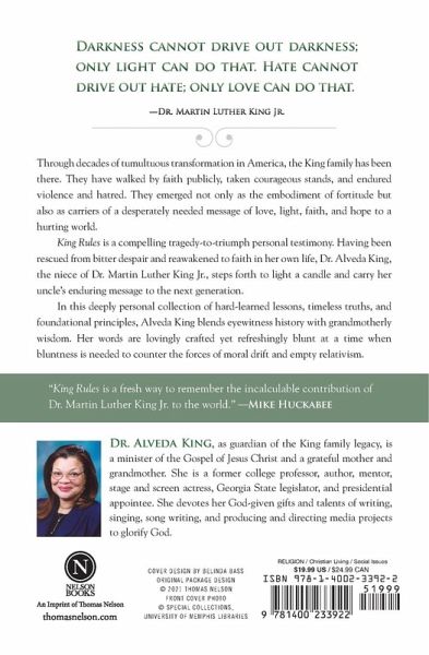In King Rules, the niece of Dr. Martin Luther King Jr. shares that message in a deeply personal collection of hard-learned lessons, timeless truths, and foundational principles. Dr. Alveda King's words are lovingly crafted yet refreshingly blunt at a time when bluntness is needed to counter the forces of moral drift and empty relativism. Beginning with a vulnerable admission of her own wounds and wanderings, Alveda unfolds eleven core values that have guided her family through generations of triumph and tragedy--and have played a pivotal role in fostering revolutionary change in society. Out of a heart of compassion, she dispenses wise meditations on bedrock subjects including faith and family, peace and justice, education and civic life. With thoughtful conviction she also boldly tackles topics considered divisive in our postmodern world, from abortion and sexuality to gun control and marriage laws. The King Rules is a page-turning narrative that blends eyewitness history with grandmotherly wisdom. And as J. C. Watts writes in the Foreword, the book is "more than Alveda's story, it's an account of the beliefs that redirected the course of a nation, that left us a legacy, and that hopefully will guide us again."