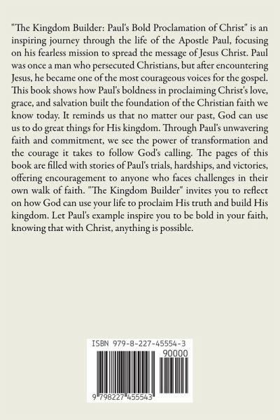 "The Kingdom Builder: Paul's Bold Proclamation of Christ" is an inspiring journey through the life of the Apostle Paul, focusing on his fearless mission to spread the message of Jesus Christ. Paul was once a man who persecuted Christians, but after encountering Jesus, he became one of the most courageous voices for the gospel. This book shows how Paul's boldness in proclaiming Christ's love, grace, and salvation built the foundation of the Christian faith we know today. It reminds us that no matter our past, God can use us to do great things for His kingdom. Through Paul's unwavering faith and commitment, we see the power of transformation and the courage it takes to follow God's calling. The pages of this book are filled with stories of Paul's trials, hardships, and victories, offering encouragement to anyone who faces challenges in their own walk of faith. "The Kingdom Builder" invites you to reflect on how God can use your life to proclaim His truth and build His kingdom. Let Paul's example inspire you to be bold in your faith, knowing that with Christ, anything is possible.