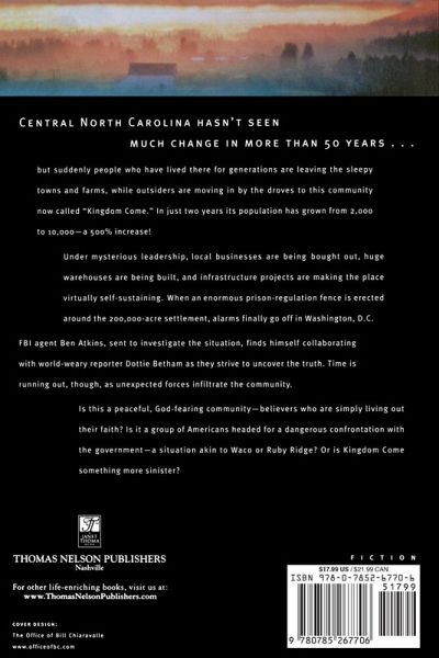 Central North Carolina hasn't seen much change in over 50 years...but suddenly people who have been there for generations are leaving the small farming settlements-lock, stock, and barrel. When massive warehouses surrounded by metal fencing seem to go up overnight, local businesses are bought out, and more than 6,000 families establish residence in a community named Kingdom Come, the FBI begins to suspect cult activity. Agent Ben Atkins is sent to investigate, and though he does sense something major happening, he is not convinced it is sinister. In fact, as he moves in for a closer look, he begins to wonder if those on the inside of Kingdom Come are working to keep evil out. But time is running short for him to discover the truth, as unexpected enemies-law enforcement agencies, media groups, and even the church hierarchy-threaten the community's existence.