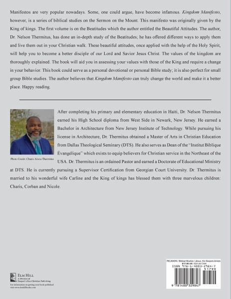 Manifestos are very popular nowadays. Some, one could argue, have become infamous. Kingdom Manifesto, however, is a series of biblical studies on the Sermon on the Mount. This manifesto was originally given by the King of kings. The first volume is on the Beatitudes which the author entitled the Beautiful Attitudes. The author, Dr. Nelson Thermitus, has done an in-depth study of the Beatitudes; he has offered different ways to apply them and live them out in your Christian walk. These beautiful attitudes, once applied with the help of the Holy Spirit, will help you to become a better disciple of our Lord and Savior Jesus Christ. The values of the kingdom are thoroughly explained. The book will aid you in assessing your values with those of the King and require a change in your behavior. This book could serve as a personal devotional or personal Bible study; it is also perfect for small group Bible studies. The author believes that Kingdom Manifesto can truly change the world and make it a better place. Happy reading.