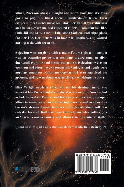 Allura Peterson always thought she knew how her life was going to play out. She'd seen it hundreds of times. Turn eighteen, meet mate, move out, start her life. It was almost a step by step everyone had repeated to her throughout her life. Little did she know Fate and the Moon Goddess had other plans for her life. Her mate was in love with another...and wanted nothing to do with her at all. Rejection was not done with a mere few words and tears. It was an extensive process, a medicine, a ceremony, an elixir that would rip your soul from your mate's. Rejections were not common and often never successful. Madness and death were popular outcomes. Only one person had ever survived the process, and he was about to turn Allura's world upside down. Elias Wright needs a mate. No, not his destined mate. She rejected him for a fling she claimed was true love. Now he had to look toward the future, and that meant a Luna for his people. Allura is smart, sexy, and everything a male could ask for. His cousin's destined mate had her own gravitational pull that called to his soul. But Elias wasn't the only one who had his eyes on Allura. A war is coming, and Allura is in the center of it all. Question is, will she save the world, or will she help destroy it?