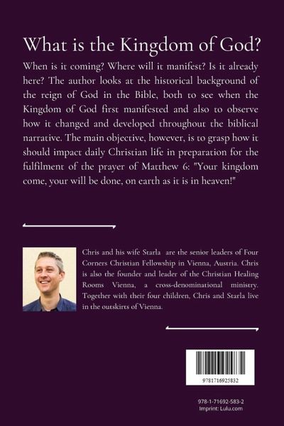 The Kingdom of God. When is it coming? Where will it manifest? Is it already here? The author looks at the historical background of the reign of God in the Bible, both to see when the Kingdom of God first manifested and also to observe how it changed and developed throughout the biblical narrative. The main objective, however, is to grasp how it should impact daily Christian life in preparation for the fulfilment of the prayer of Matthew 6: "Your kingdom come, your will be done, on eath as it is in heaven!"
