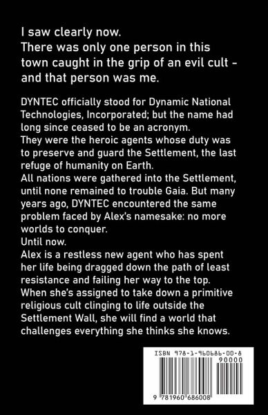 Alex is a restless new agent who's spent her life being dragged down the path of least resistance and failing her way to the top. When she's assigned a new job with Dynamic National Technologies, Incorporated, she's promised an action-packed life of stopping crime, collaring evil Detractors, and committing espionage using cool guns and cool tech. Inside the Settlement, a metropolitan enclave 20 by 20 miles square, everyone has an assigned role to play in working toward the ultimate survival of humanity, under the watchful eye of the Administrators. Outside the Wall, there is only a barren wasteland; a lifeless Earth destroyed by greed. When DYNTEC sends Alex on a mission beyond the Wall to infiltrate a mysterious religious cult known as the "Kingdom of Heaven", what she finds there will challenge everything she believes to be true. Ultimately she will be forced to reexamine her loyalties, and choose between the Kingdom of Heaven and the kingdom of Earth.