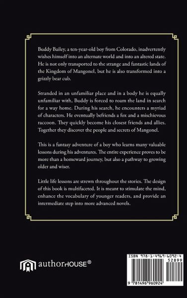 Buddy Bailey, a ten-year-old boy from Colorado, inadvertently wishes himself into an alternate world and into an altered state. He is not only transported to the strange and fantastic lands of the Kingdom of Mangonel, but he is also transformed into a grizzly bear cub. Stranded in an unfamiliar place and in a body he is equally unfamiliar with, Buddy is forced to roam the land in search for a way home. During his search, he encounters a myriad of characters. He eventually befriends a fox and a mischievous raccoon. They quickly become his closest friends and allies. Together they discover the people and secrets of Mangonel. This is a fantasy adventure of a boy who learns many valuable lessons during his adventures. The entire experience proves to be more than a homeward journey, but also a pathway to growing older and wiser. Little life lessons are strewn throughout the stories. The design of this book is multifaceted. It is meant to stimulate the mind, enhance the vocabulary of younger readers, and provide an intermediate step into more advanced novels.