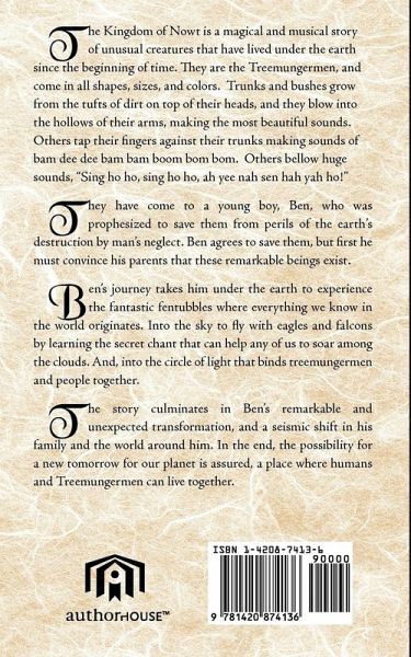 The Kingdom of Nowt is a magical and musical story of unusual creatures that have lived under the earth since the beginning of time. They are the Treemungermen, and come in all shapes, sizes, and colors. Trunks and bushes grow from the tufts of dirt on top of their heads, and they blow into the hollows of their arms, making the most beautiful sounds. Others tap their fingers against their trunks making sounds of bam dee dee bam bam boom bom bom. Others bellow huge sounds, "Sing ho ho, sing ho ho, ah yee nah sen hah yah ho!" They have come to a young boy, Ben, who was prophesized to save them from perils of the earth's destruction by man's neglect. Ben agrees to save them, but first he must convince his parents that these remarkable beings exist. Ben's journey takes him under the earth to experience the fantastic fentubbles where everything we know in the world originates. Into the sky to fly with eagles and falcons by learning the secret chant that can help any of us to soar among the clouds. And, into the circle of light that binds treemungermen and people together. The story culminates in Ben's remarkable and unexpected transformation, and a seismic shift in his family and the world around him. In the end, the possibility for a new tomorrow for our planet is assured, a place where humans and Treemungermen can live together.