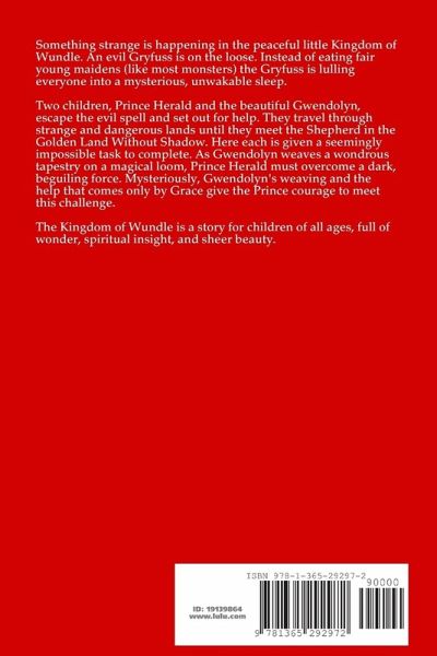 Something strange is happening in the peaceful little Kingdom of Wundle. An evil Gryfuss is on the loose. Instead of eating fair young maidens (like most monsters) the Gryfuss is lulling everyone into a mysterious, unwakable sleep... Two children, Prince Herald and the beautiful Gwendolyn, escape the evil spell and set out for help. They travel through strange and dangerous lands until they meet the Shepherd in the Golden Land Without Shadow. Here each is given a seemingly impossible task to complete. As Gwendolyn weaves a wondrous tapestry on a magical loom, Prince Herald must overcome a dark, beguiling force. Mysteriously, Gwendolyn's weaving and the help that comes only by Grace give the Prince courage to meet this challenge... The Kingdom of Wundle is a story for children of all ages, full of wonder, spiritual insight, and sheer beauty.