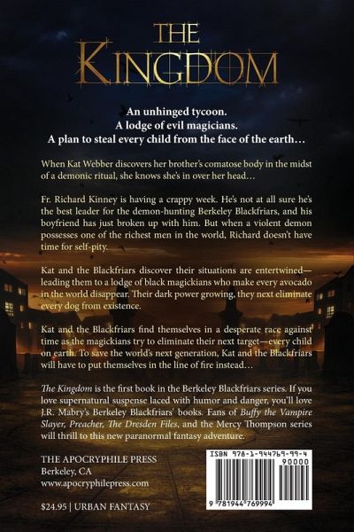 An unhinged tycoon. A lodge of evil magicians. A plan to steal every child from the face of the earth. Fr. Richard Kinney is having a crappy week. He’s not at all sure he’s the best leader for the demon-hunting Berkeley Blackfriars, his boyfriend has just broken up with him, and his last exorcism did not go well. Kat Webber is in over her head. After discovering her brother’s comatose body in the midst of a demonic ritual, her heart sinks as she realizes he was up to something sketchy…maybe even evil. Reaching out to the Blackfriars for help, Kat and Richard uncover a lodge of evil magickians who make every avocado in the world disappear—then every dog. It’s a race against time as Kat and the Blackfriars try to stop the magickians from eliminating their next target—every child on earth. Fans of Buffy the Vampire Slayer, Preacher, The Dresden Files, and the Mercy Thompson series will love this spine-tingling yet humorous supernatural suspense novel. Scroll up to buy or borrow, and enter The Kingdom today! WARNING: This book contains adult language and sexual situations. Not appropriate for children or people who are easily offended!