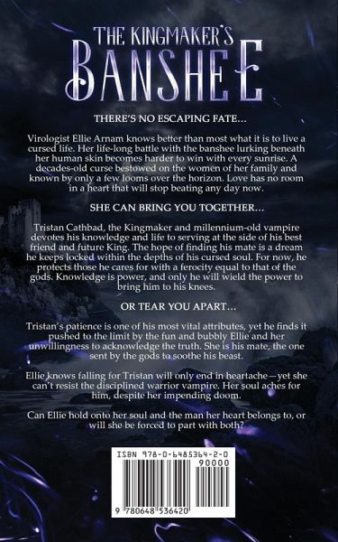 The first enthralling instalment in The Immortal's of Death series. THERE'S NO ESCAPING FATE... Virologist Ellie Arnam knows better than most what it is to live a cursed life. Her life-long battle with the banshee lurking beneath her human skin becomes harder to win with every sunrise. A decades-old curse bestowed on the women of her family and known by only a few looms over the horizon. Love has no room in a heart that will stop beating any day now. SHE CAN BRING YOU TOGETHER... Tristan Cathbad, the Kingmaker and millennium-old vampire devotes his knowledge and life to serving at the side of his best friend and future King. The hope of finding his mate is a dream he keeps locked within the depths of his cursed soul. For now, he protects those he cares for with a ferocity equal to that of the gods. Knowledge is power, and only he will wield the power to bring him to his knees. OR TEAR YOU APART... Tristan's patience is one of his most vital attributes, yet he finds it pushed to the limit by the fun and bubbly Ellie and her unwillingness to acknowledge the truth. She is his mate, the one sent by the gods to soothe his beast. Ellie knows falling for Tristan will only end in heartache-yet she can't resist the disciplined warrior vampire. Her soul aches for him, despite her impending doom. Can Ellie hold onto her soul and the man her heart belongs to, or will she be forced to part with both?